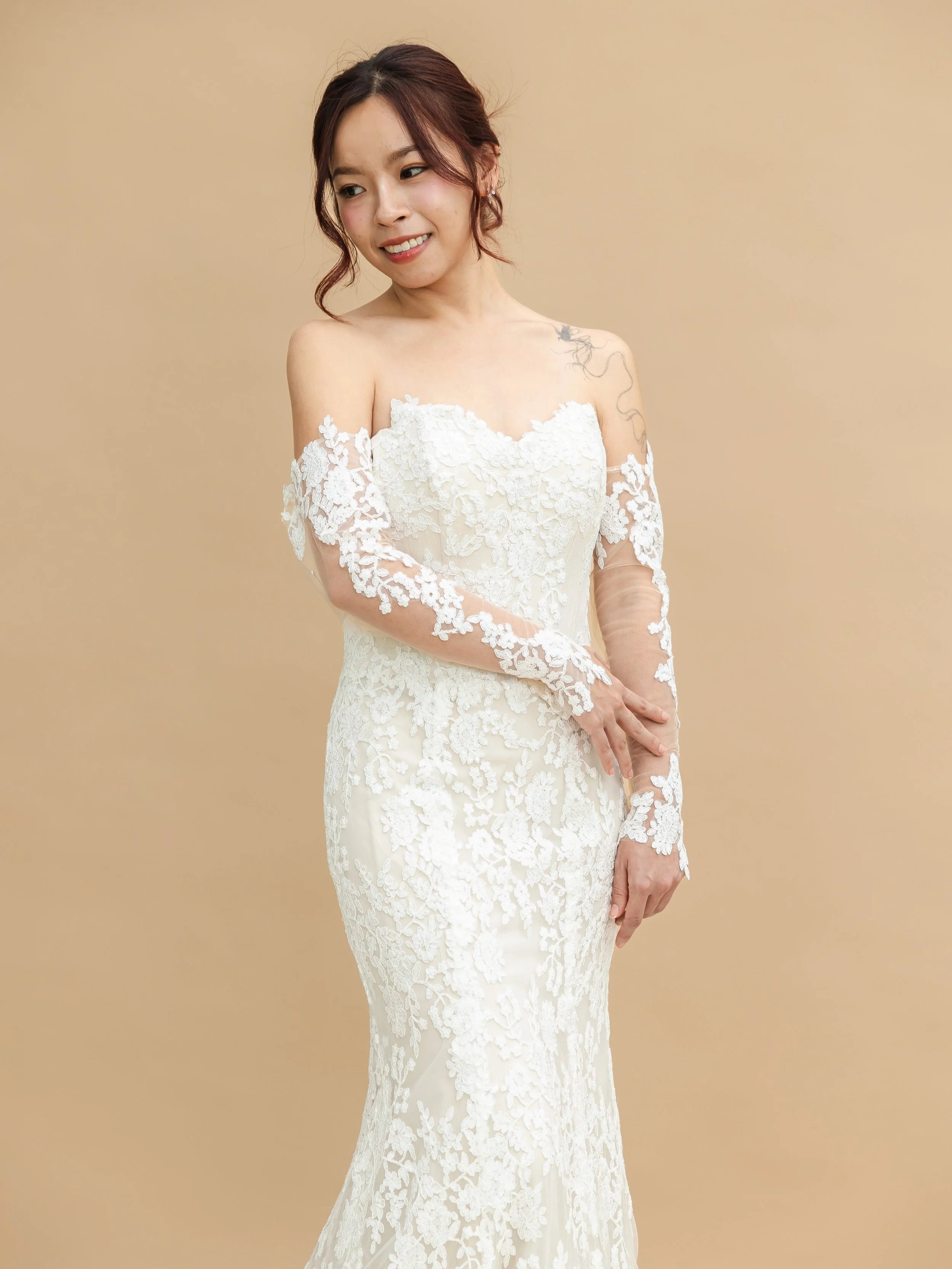 This refined mermaid silhouette is defined by its intricate all-over floral lace, which meticulously contours the figure before cascading into a romantic, sweeping train. The centrepiece of the design is her detachable, sheer lace sleeves; wear them for a touch of vintage-inspired charm during your ceremony, then remove them to reveal a sleek, strapless look for your reception. It is the perfect thread for the bride who desires both timeless elegance and a modern, adaptable finish that honours the sincerity of her wedding troth.
